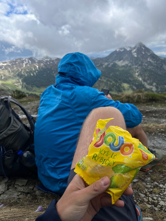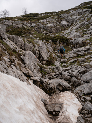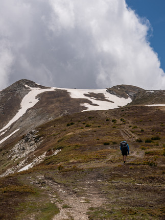 Pár km klesání a poté už jsme plynule stoupali podél potoku a krásnou alpskou pastvinou. Bylo opravdu na co koukat. Počasí si každý den s námi pěkně hraje - sluníčko, pak zataženo, pár kapek, sluníčko… furt takhle dokola. Dneska začalo dost studeně foukat, takže skoro celý den jsem byl nucený být v bundě a když zastavíme tak dokonce nahodit i péřovku. Pod prvním sedlem Qafa Roskhodol jsme udělali kafe. Následně nás čekalo nás pár sněhových úseků, které se dali projít bez nesmeků. Nahoře jsme na výhledu dali svačinu, kterou jsme od pana také dostali na cestu (tento komplet mimochodem - spaní, večeře, snídaně, svačina- stoji 35eur na osobu).